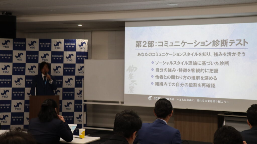 第2部のコミュニケーション診断テストでは、組織強化委員会 山口良樹(やまぐち よしき)君の進行でソーシャルスタイル理論に基づいた診断テストが行われました。